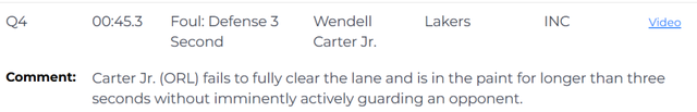第二次漏判发生在距离比赛结束还有45.3秒,魔术的小卡特在没有积极防守对位球员的情况下,在己方禁区停留时间超过3秒,这是一次漏吹的防守三秒违例,湖人吃亏,魔术获利。