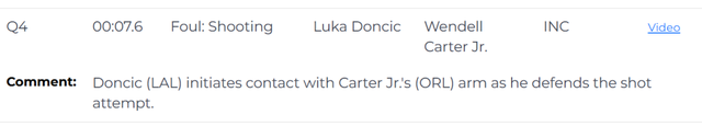 第三次漏判发生在距离比赛结束还有7.6秒。东契奇在防守小卡特的投篮时,主动用身体接触对方手臂。这是一次漏吹的防守犯规,小卡特把球打进,本该加罚一次,裁判没有响哨,这次漏判是湖人获利,魔术吃亏。